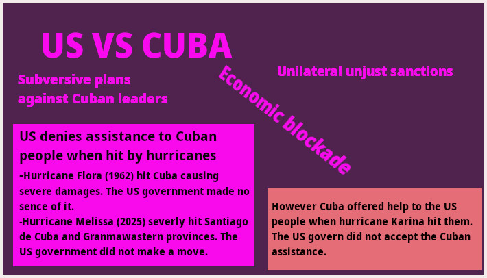 US policy towards Cuba after 1959 has that of aggression and constant hostility in all fields of the political, social economic life of the island. They have forgotten the roots of their Independence War. They simply disregard humanitarianism, even when natural events have hit severely Cuba.