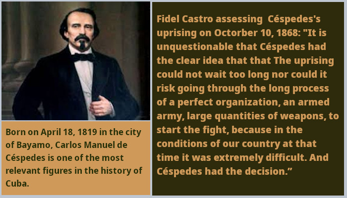 “There is, of course, no doubt that Céspedes symbolized the spirit of Cubans of that era, he symbolized the dignity and rebelliousness of a people —still heterogeneous— that was beginning to emerge in history. Céspedes was, without question, the most determined of the 1868 conspirators to take up arms. Some interpretations have been made of his attitude, when in reality his conduct had a single motivation. In every meeting of the conspirators, Céspedes always proved to be the most resolute.”