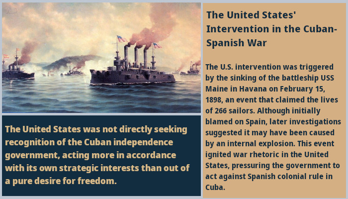 The U.S. intervention was triggered by the sinking of the battleship USS Maine in Havana on February 15, 1898, an event that claimed the lives of 266 sailors. Although initially blamed on Spain, later investigations suggested it may have been caused by an internal explosion. This event ignited war rhetoric in the United States, pressuring the government to act against Spanish colonial rule in Cuba.