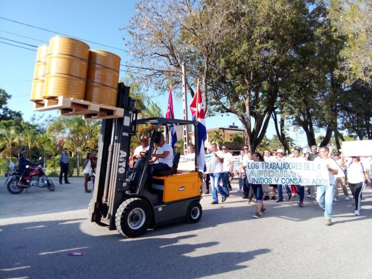Las máximas autoridades del Partido Comunista de Cuba y del Gobierno local encabezan el desfile del pueblo trabajador.